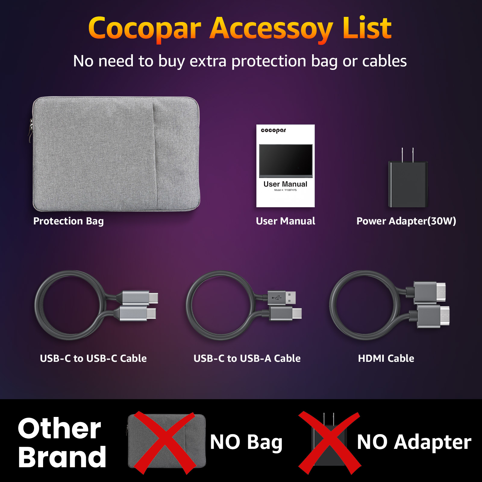 Ultra-Portable 18.5-inch Display: Cocopar portable travel monitor is with an 18.5-inch 1080p FHD IPS screen, this display enhances your visual experience. Weighing just 2.2 pounds and measuring 0.17 inches at the slimmest point, it easily fits in your bag for travel, work, or on-the-go use. The borderless, slim design ensures effortless portability, offering a second screen wherever you need it